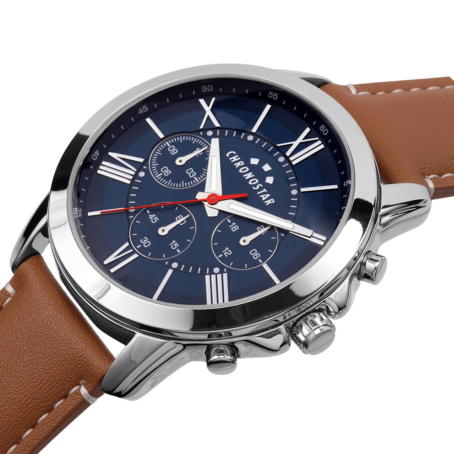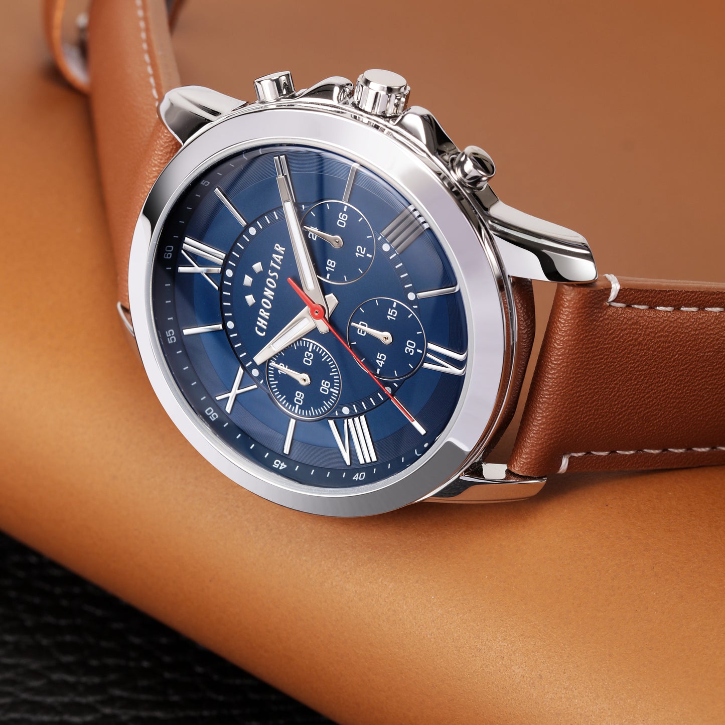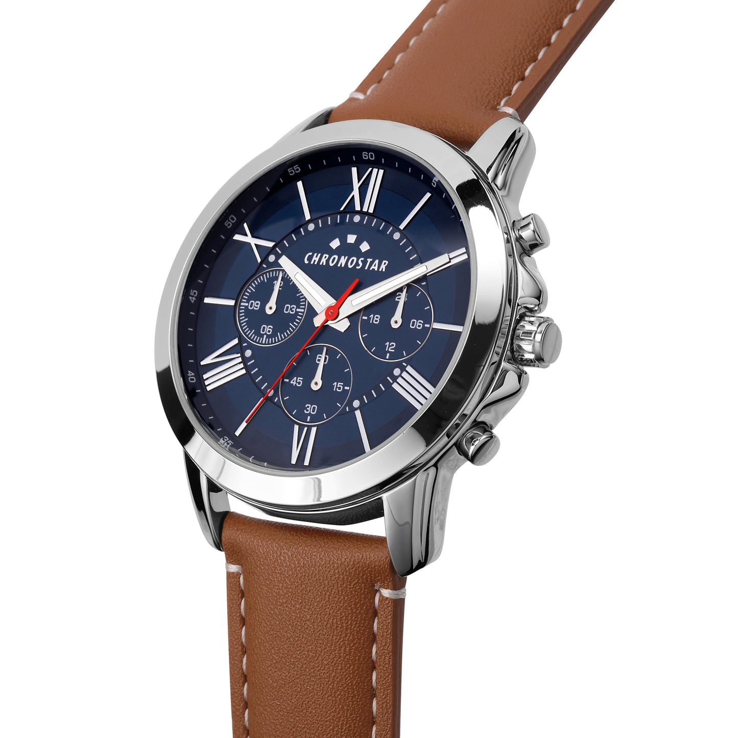 Montre homme CHRONOSTAR de la collection SPORTY. Montre avec mouvement MVT.VD34A(TYPE M), fonction multifonction. Cadran : Multifonction 3 contacteurs, finition alliage. Couleur BLEU polie. Type de bracelet : Semi-bordé. Matériau du bracelet : Synthétique marron. Boîtier en verre minéral taille 44. Fermoir : boucle ARDIGLIONE. Résistance à l'eau : 3 ATM. Poids : 62,5 g. Code produit : R3751271008. Couleur argent. Matériaux : Alliage. PVD Argent. Cuir naturel. Emballage : boîte d'origine CHRONOSTAR. Garantie : Garantie internationale CHRONOSTAR