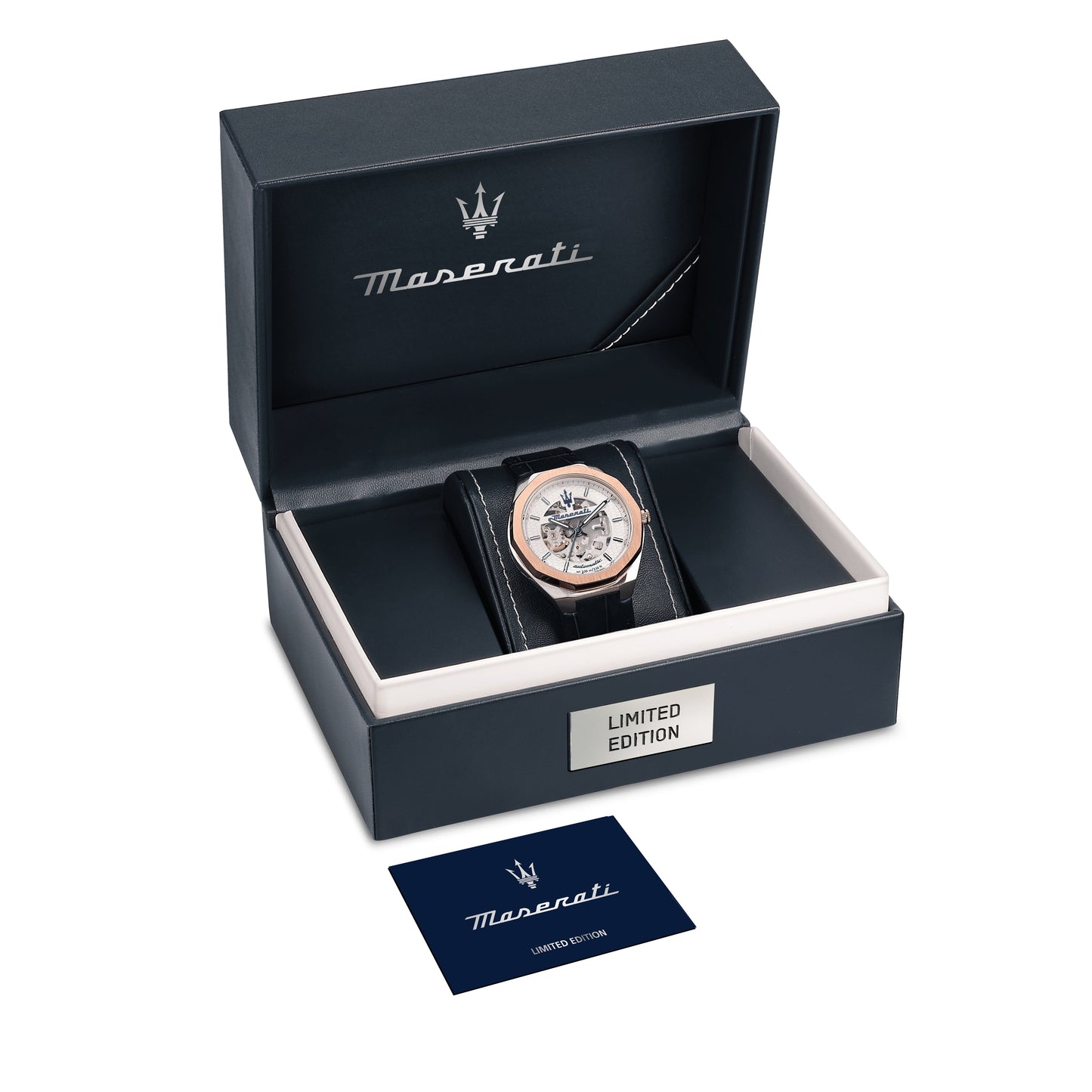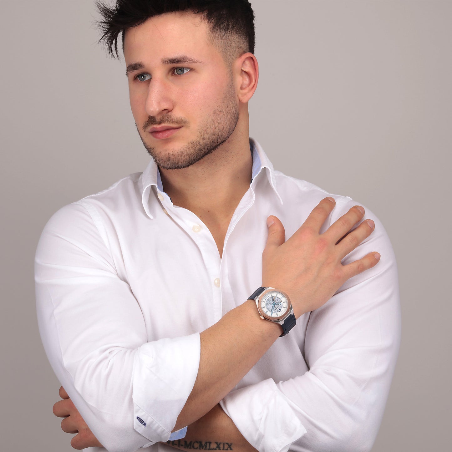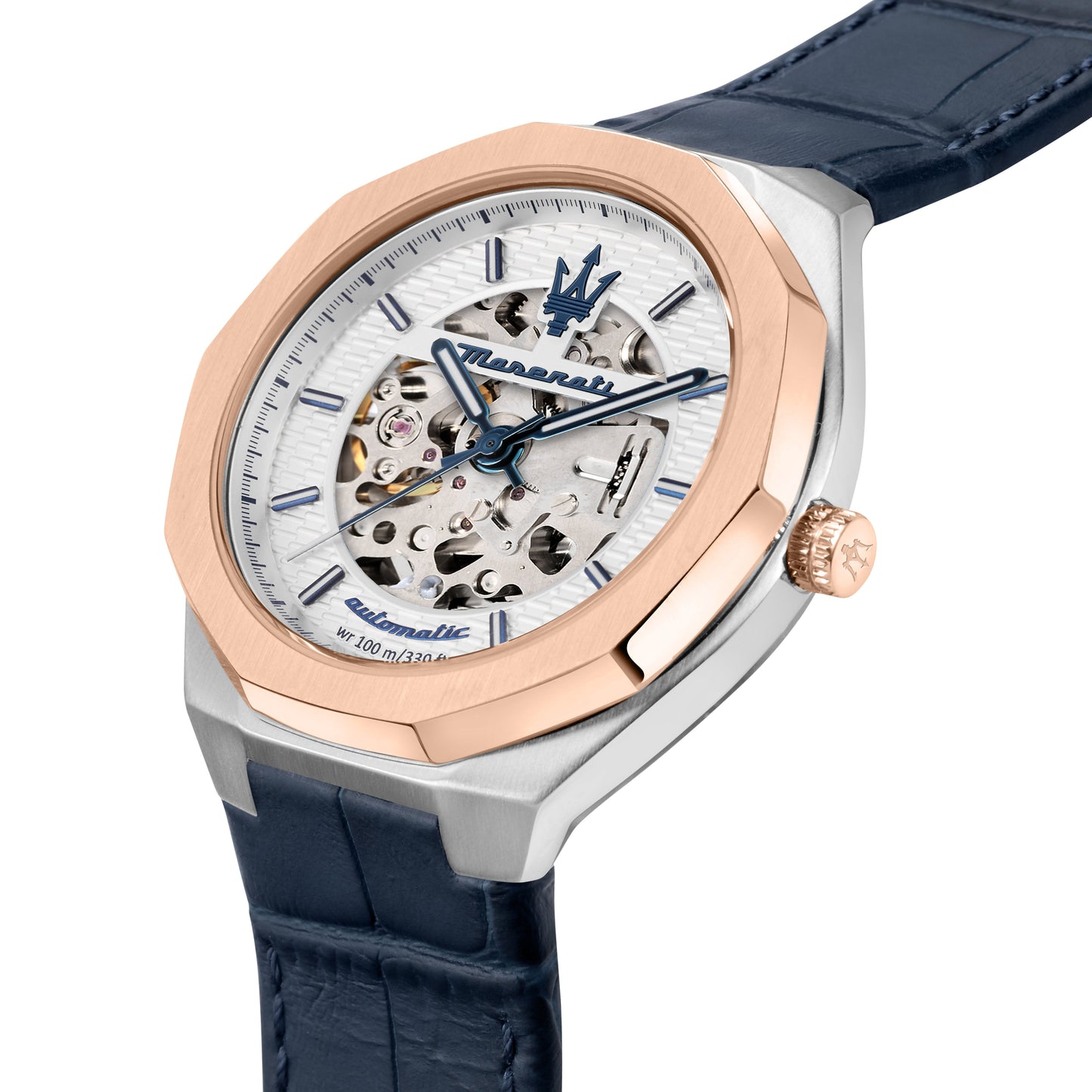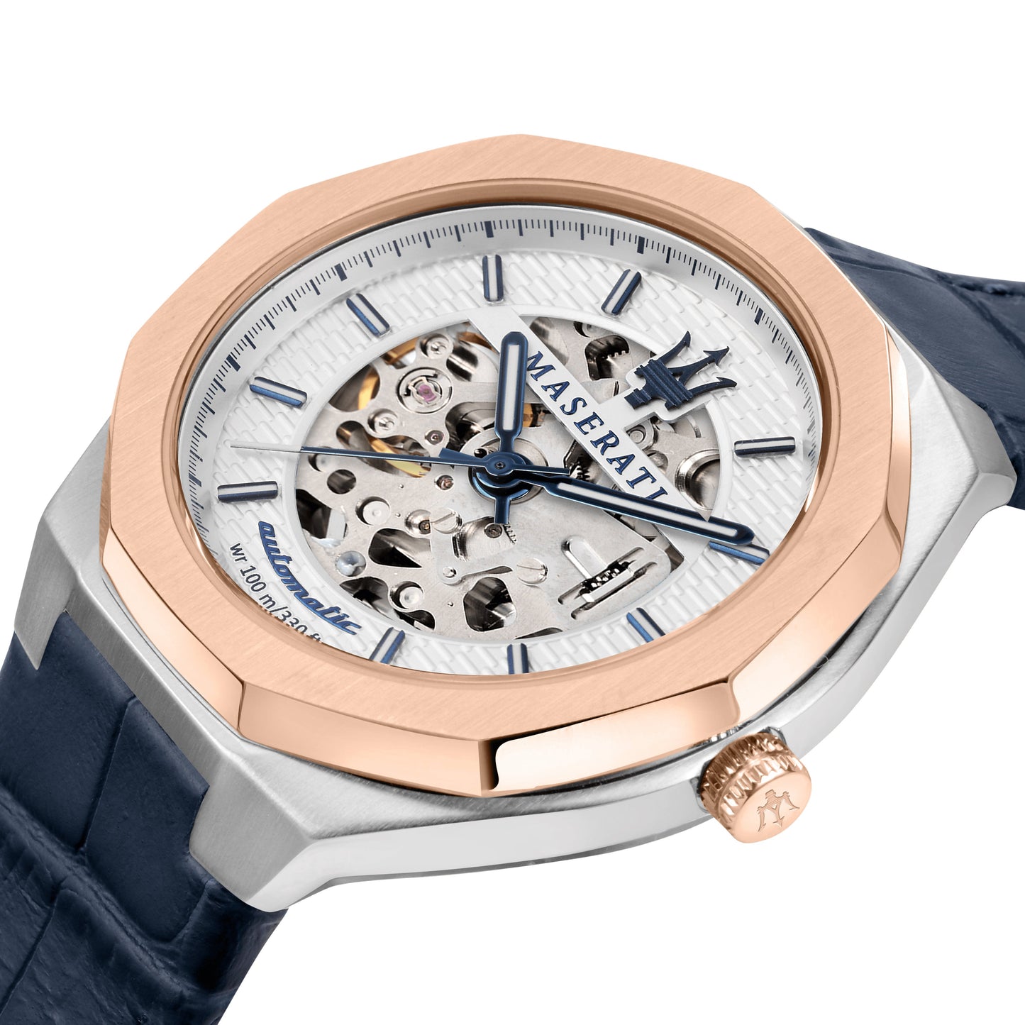 Montre homme MASERATI de la collection STILE. Montre avec mouvement MVT AUTO NH70, fonction Automatique. Cadran : 3 aiguilles index, finition acier brossé et raffiné, coloris BLANC. MULTI-FINITIONS. Type de bracelet : Semi-bordé. Matière du bracelet : Bracelet en cuir bleu. Boîtier en verre minéral, traitement saphir taille 42. Fermoir : boucle ARDIGLIONE. Résistance à l'eau : 10 ATM. Poids : 91,93 g. Code produit : R8821142001. Couleur argent. OR ROSE. Matériaux : Acier. Cuir naturel. Emballage : boîte d'origine MASERATI. Garantie : Garantie internationale MASERATI