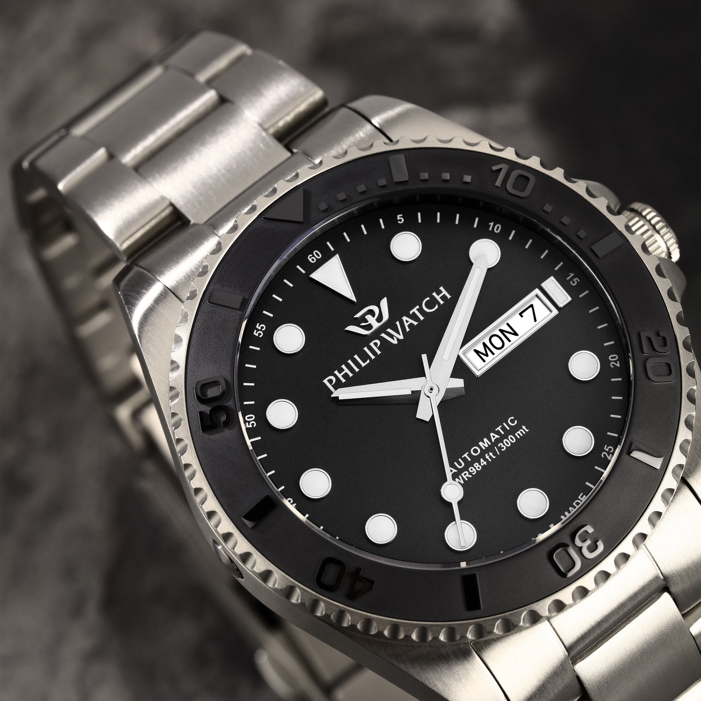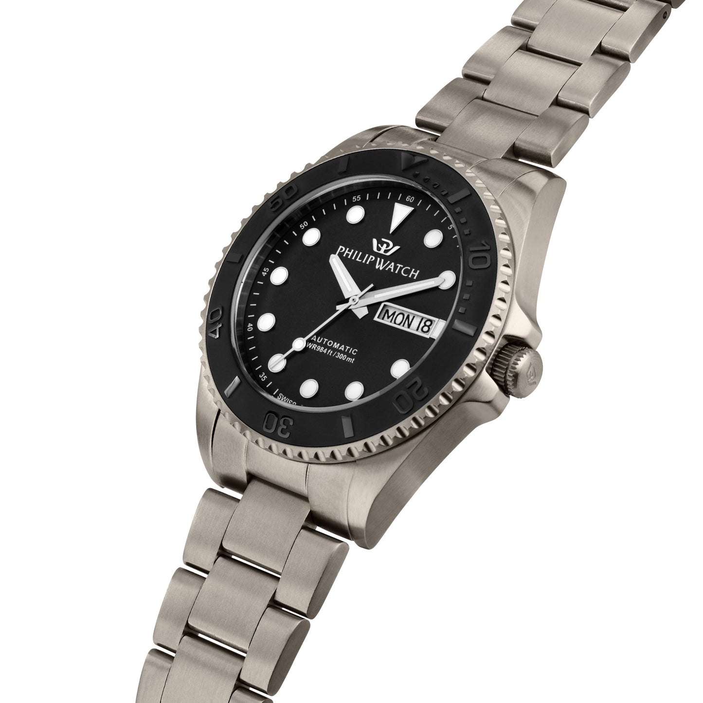 MONTRE PHILIP WATCH CARIBE POUR HOMMES R8223597036. Montre automatique avec mouvement MVT.SW220. Couleur argent. Matériaux : Titane. Cadran verre saphir, traitement antireflet NOIR, SABLÉ à 3 aiguilles appliques avec/affichage de la date à 3h, finition satinée. Taille du boîtier : 42. Bracelet en titane massif de couleur argent. Fermeture : Boucle plongeur avec boutons. verrouillage de sécurité et extension Emballage : boîte d'origine PHILIP WATCH. Produit avec garantie internationale PHILIP WATCH.