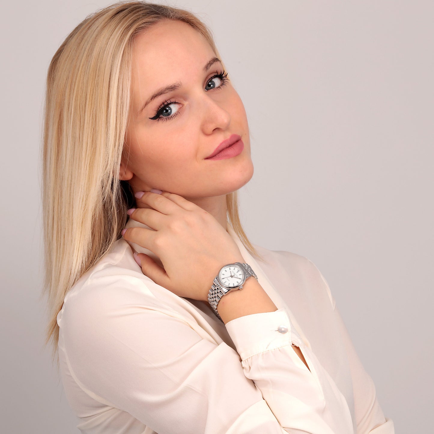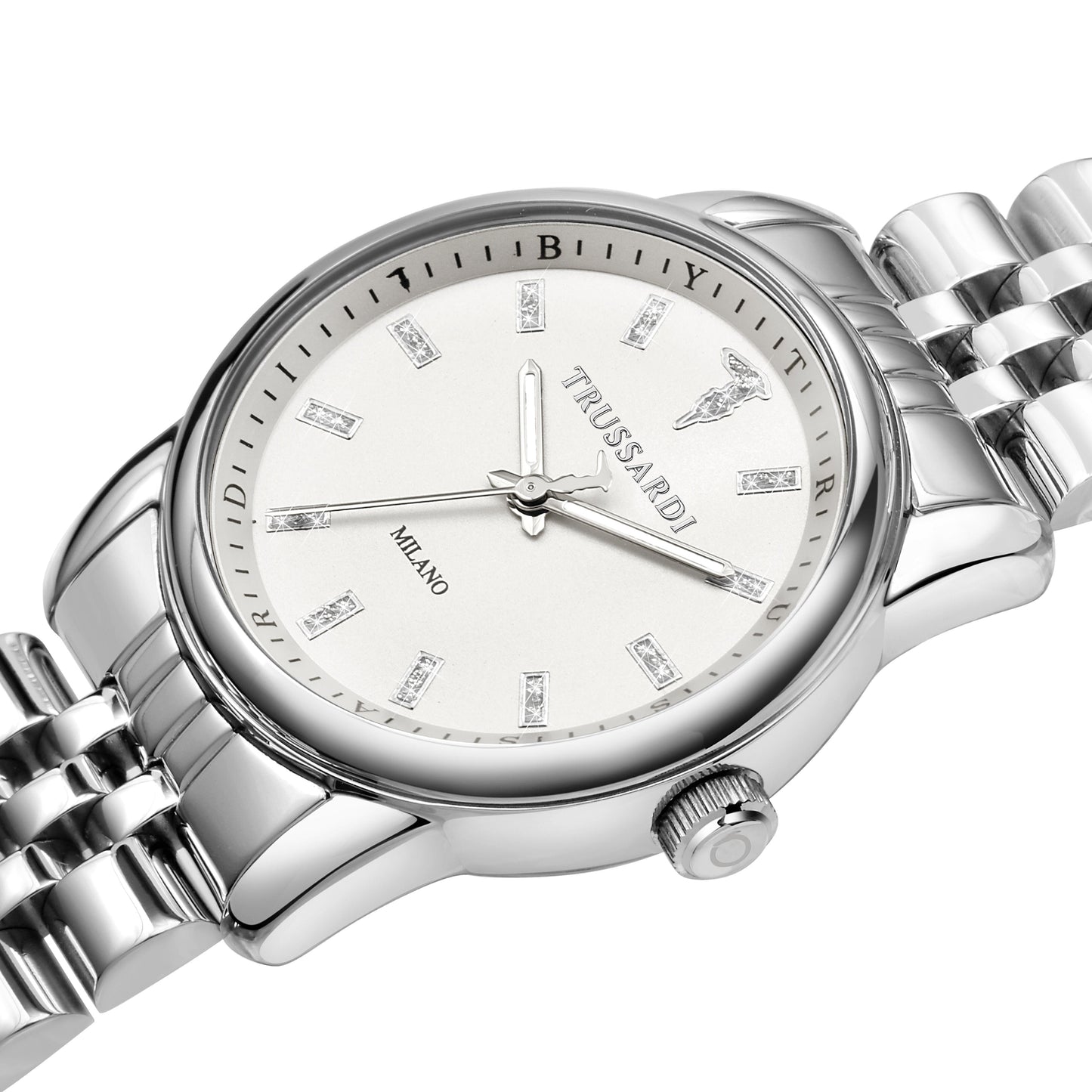 Montre femme TRUSSARDI de la collection T-JOY. Montre avec mouvement MVT. M2036, fonction heure uniquement. 3H. Cadran : 3 aiguilles UPMR, finition Acier. couleur BLANCHE brillante. Type de bracelet : capuchon plié. Matériau du bracelet : bracelet en métal de couleur acier. Boîtier en verre minéral taille 30. Fermeture : boucle DÉPLOYANTE avec boutons. Résistance à l'eau : 5 ATM. Poids : 86,5 g. Code produit : R2453150507. Matériaux : Acier. Emballage : boîte d'origine TRUSSARDI. Garantie : Garantie internationale TRUSSARDI