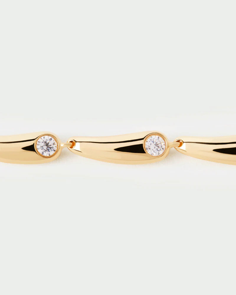Bracelet PDPaola The New Essentials PU01-932-M. Ce bracelet PDPAOLA PU01-932-M, issu de la collection Caramelle, est une pièce raffinée confectionnée en argent sterling 925 recyclé plaqué or 18 carats. Orné de zirconiums blancs, il dégage un éclat élégant et discret. Le design en forme de goutte d'eau crée un effet fluide et sophistiqué, tandis que sa longueur de 21 cm en taille M assure un ajustement parfait. Un accessoire contemporain et polyvalent, conçu pour apporter une touche de lumière et de sophistication à toutes vos tenues.