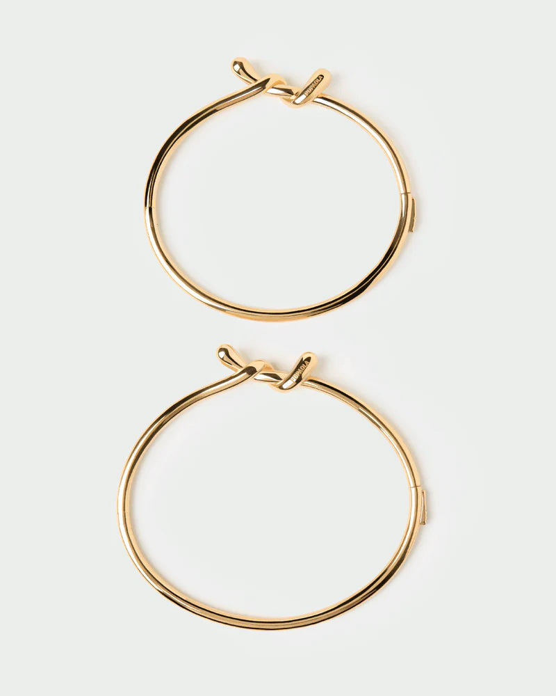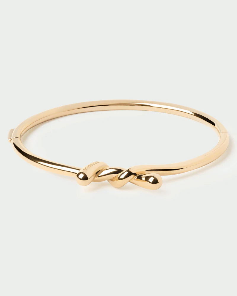 Bracelet Twist PDPaola PU01-853-S. Le bracelet Twist PDPAOLA (PU01-853-S) est un bracelet rigide et élégant à la forme fluide et torsadée, confectionné en argent sterling 925 recyclé et plaqué or 18 carats pour une brillance sophistiquée. D'une épaisseur d'environ 2,7 mm, il est disponible en taille S (dimensions intérieures : 4,5 x 5,5 cm). Son fermoir à charnière allie sécurité et facilité d'utilisation. Son design en spirale évoque le mouvement et l'élégance, faisant de ce bracelet une pièce distinctive et raffinée, idéale pour sublimer toutes vos tenues.