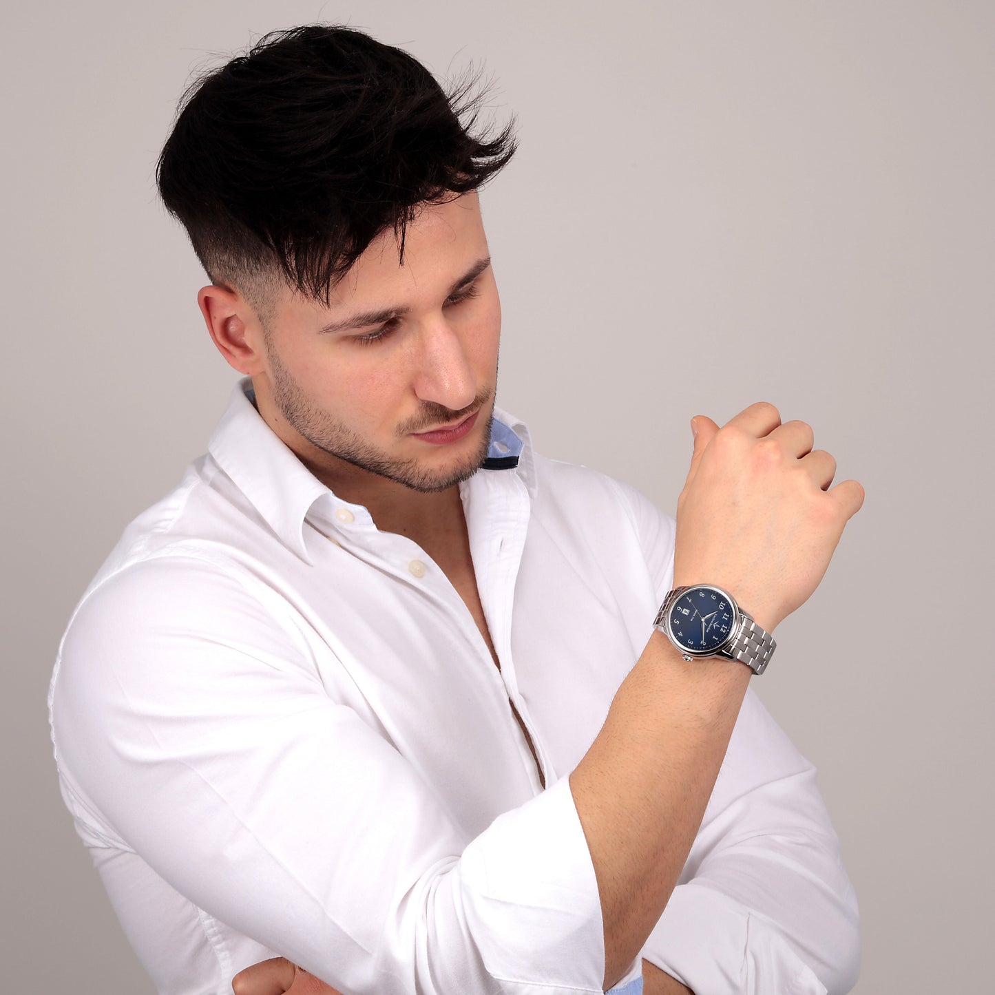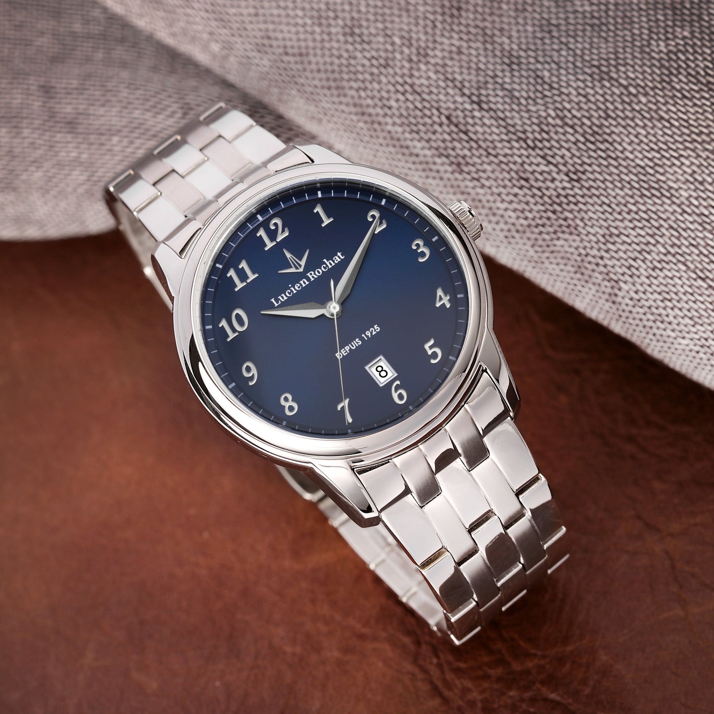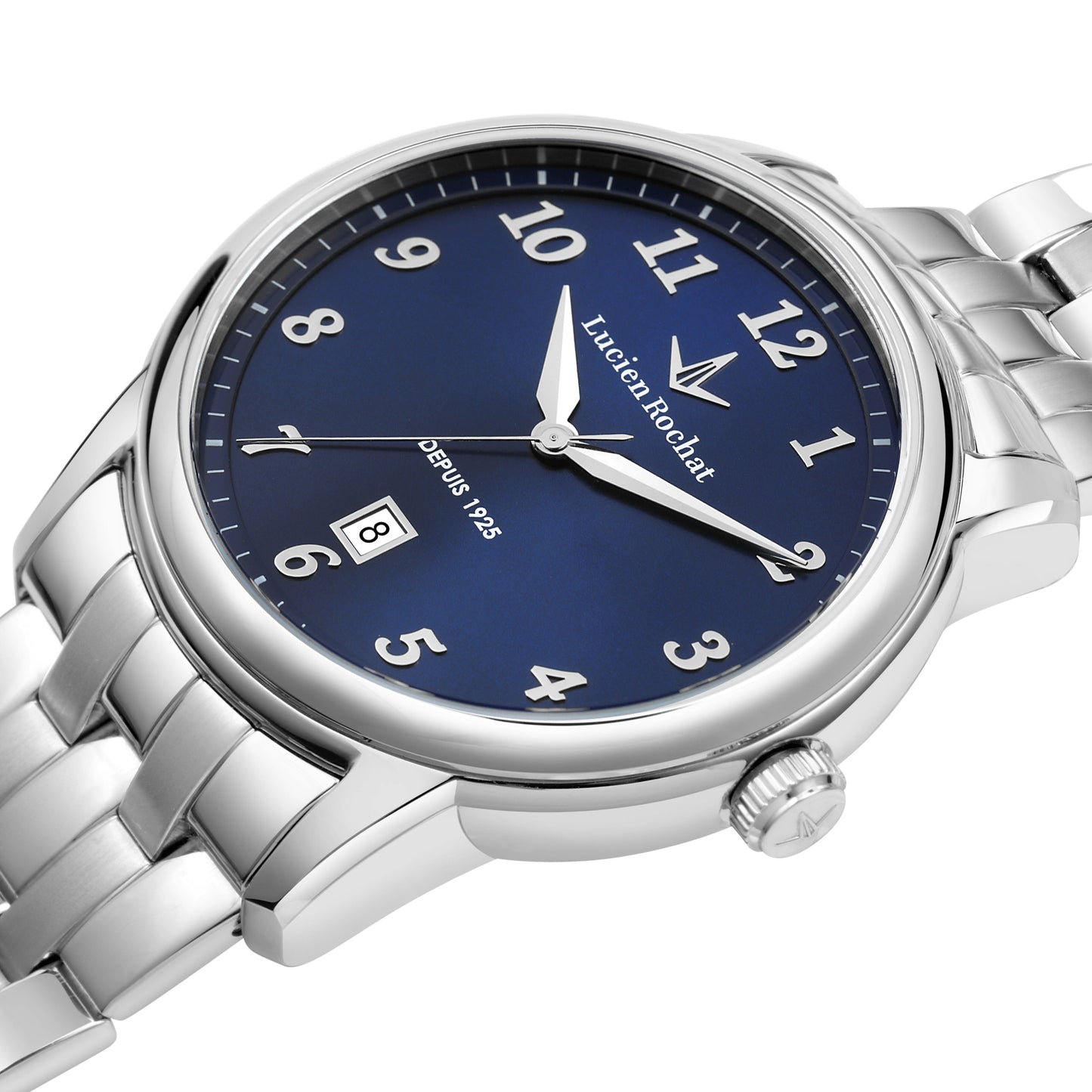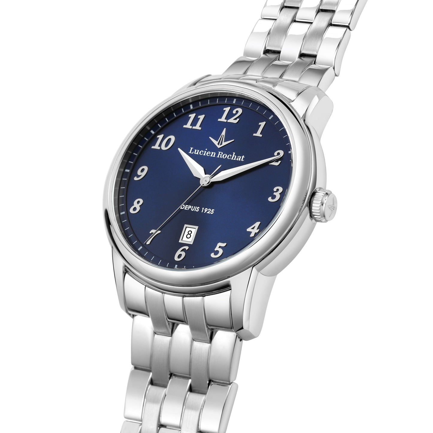 Montre homme LUCIEN ROCHAT de la collection ICONIC. Montre avec mouvement MVT. MIYOTA 2315, fonction heure et date. Cadran : 3 aiguilles chiffres arabes + index avec affichage de la date à 6h, finition Acier. couleur BLEU brillante. RAYON DU SOLEIL. Type de bande : Solide. Matériau du bracelet : bracelet en métal de couleur acier. Boîtier en verre minéral, traitement saphir, taille 42. Fermoir : Boucle PAPILLON avec boutons. Résistance à l'eau : 3 ATM. Poids : 155 gr. Code produit : R0453116002. Couleur argent. Matériaux : Acier. Conditionnement : boîte d'origine LUCIEN ROCHAT. Garantie : Garantie internationale LUCIEN ROCHAT