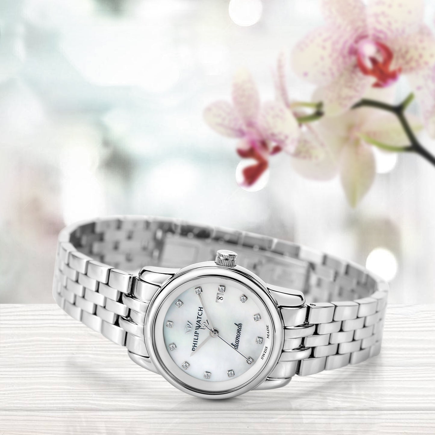 MONTRE ANNIVERSAIRE PHILIP WATCH R8253150505. Montre heure seulement pour femme de Philip Watch de la collection anniversaire. Montre avec boîtier en acier poli mesurant 36,5x30 mm. Cadran blanc et bracelet en acier argenté avec boucle papillon. Verre minéral. Mvt. Ronda 585 3h date h3 aig. 2. Résistance à l'eau de 10 atm. Emballage : Boîte d'origine Philip Watch. Garantie : Garantie internationale Philip Watch.